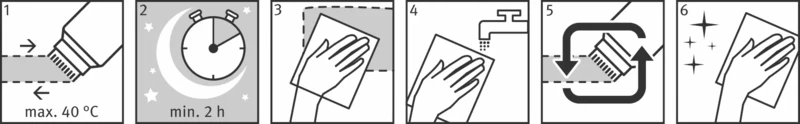 - sredstvo za čišćenje ravnomjerno nanesite na ohlađenu površinu (maks. 40°C) i ostavite da djeluje najmanje 2 sata